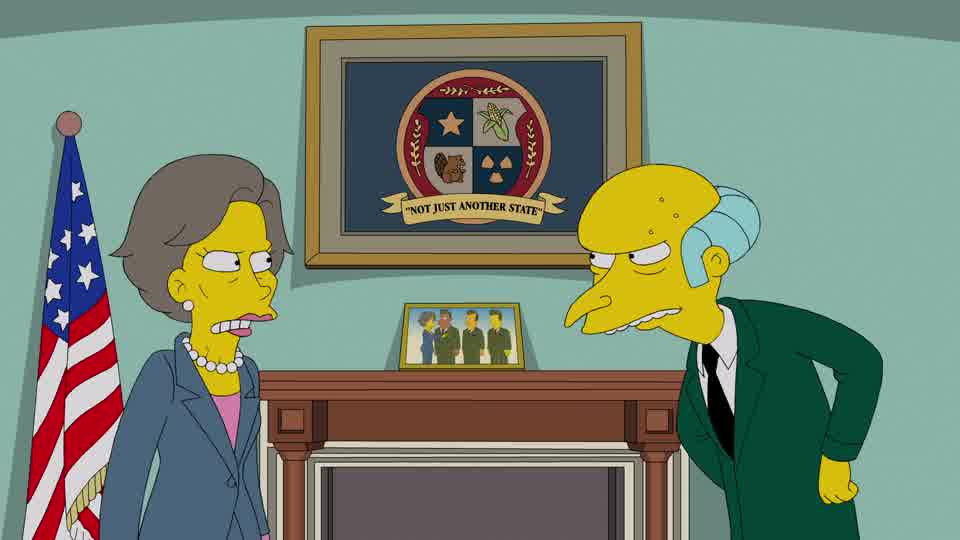 Lorsque le feu se déclare au milieu de l’installation d’approvisionnements d’eau des Simpson, ils découvrent que M. Burns extrait de l’huile de schiste dans le sol en dessous. Pour soutenir ses actions de façon politiques, Burns courtise une députée démocrate (voix de Jane Fonda).